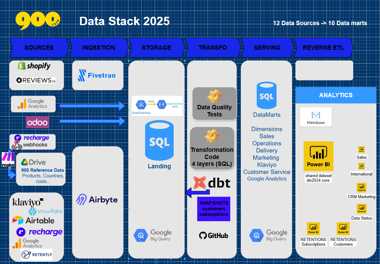 Shopify, Recharge ,Yotpo, Funnel.io , Google Big Query Datawarehouse, R scripts for API data ingestion, Power BI reporting on commercial activity, churn stats, average order value, Life TIme Value and Cost of acquitions reports.Integration of Shopify, Klaviyo, Gorgias, Recharge.